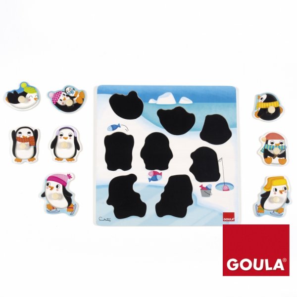Puzzle in legno composto da 8 scene con simpatici pinguini rappresentati in diverse posizioni durante la loro giornata.